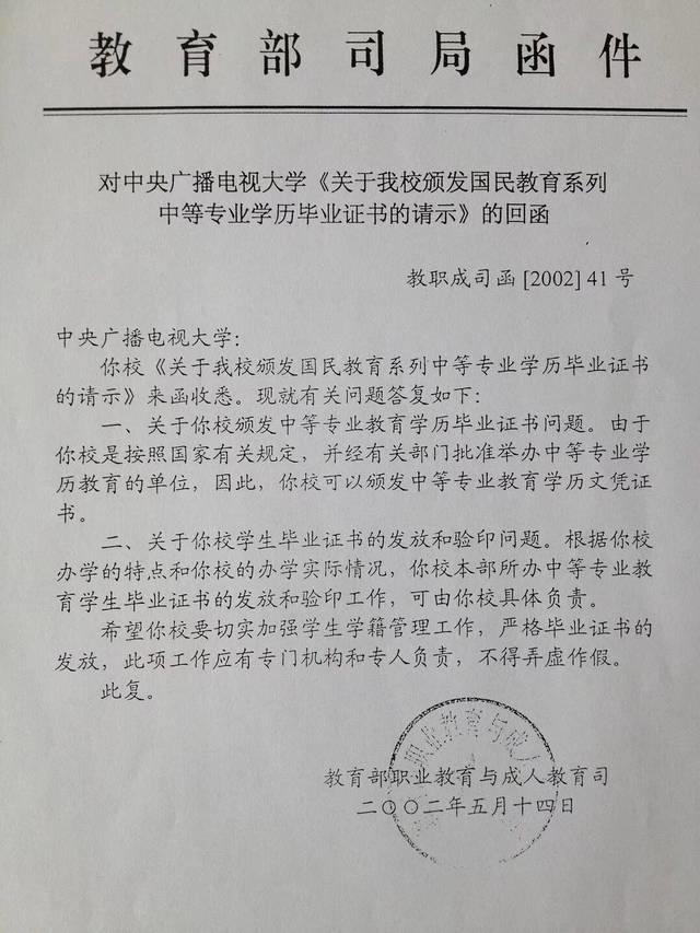 2.《对中央广播电视大学<关于我校颁发国民教育系列中等专业学历毕业证书的请示>的回函》(教职成司函〔2002〕41号)是否依然有效?