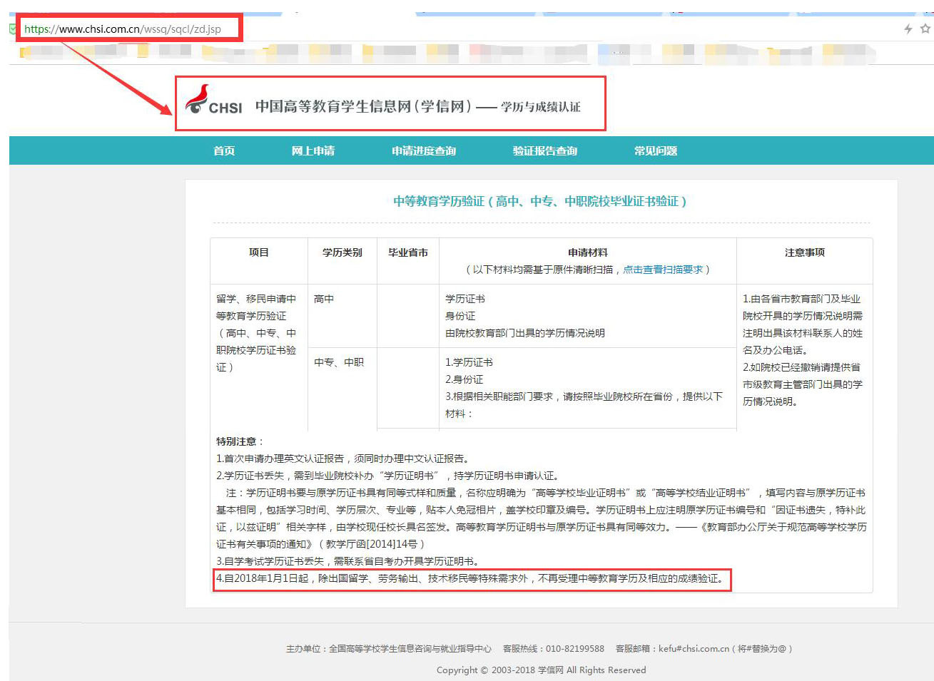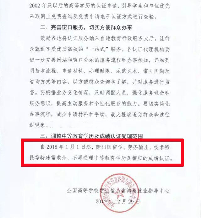 中国高等教育学生信息网(学信网)正式通知,自2018年1月1日起,除“涉外”特殊需求外,不再受理全国中等学历及相应成绩单认证,出台的对应政策就是,学信网不直接出受理中等学历认证。中专学历,除了以下情况,可以做认证,其他的都不能在学信网做认证。
