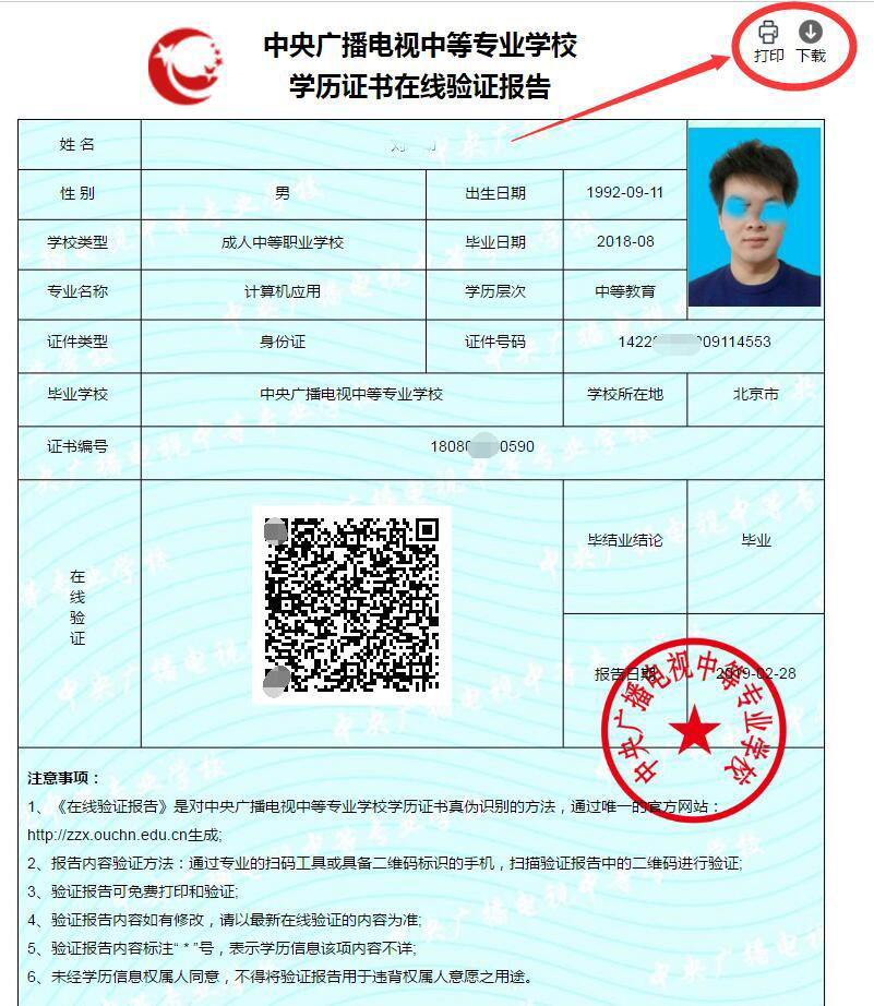 我们点击生成验证报告,即可看到到详细的验证报告,我们可以选择将其打印出来,也可以选择下载保存到移动设备方便查验