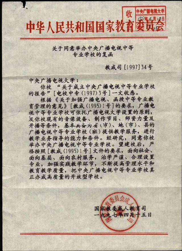 以下是 中华人民共和国国家教育委员会“关于同意举办中央广播电视中等专业学校的复函”