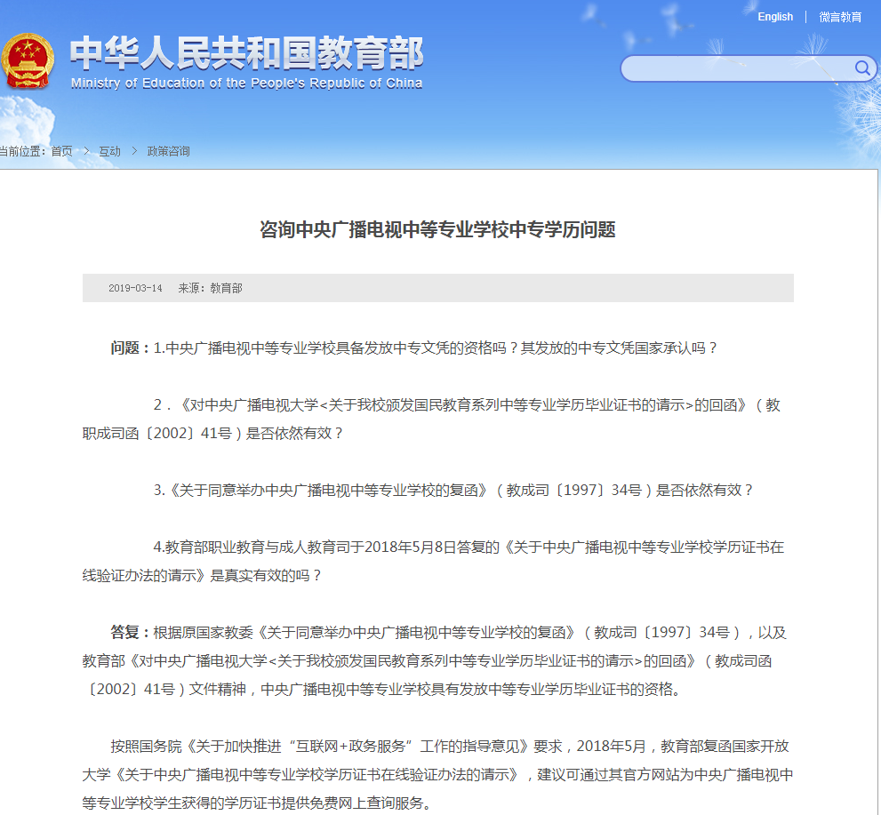 4.教育部职业教育与成人教育司于2018年5月8日答复的《关于中央广播电视中等专业学校学历证书在线验证办法的请示》是真实有效的吗?