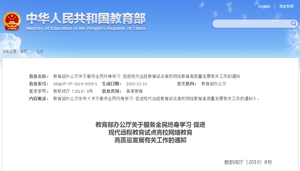教育部办公厅发布《关于服务全民终身学习 促进现代远程教育试点高校网络教育高质量发展有关工作的通知》