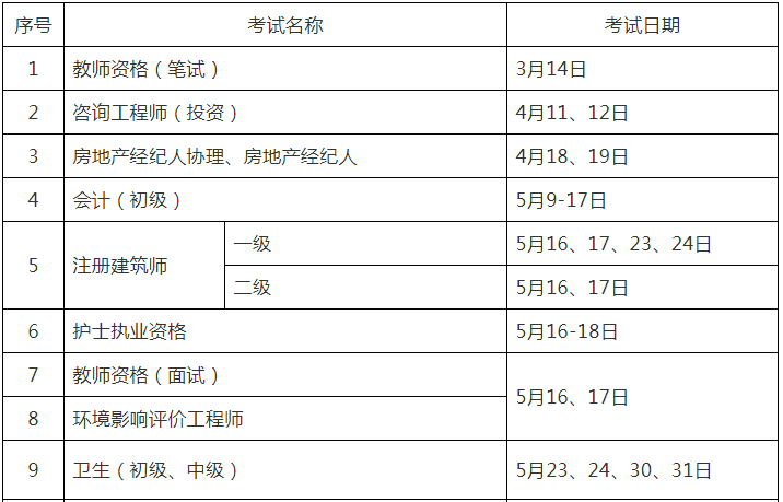 一、请按照《2020年度专业技术人员职业资格考试工作计划》(见附件)做好考试组织实施工作,确保各项考试安全顺利进行。如遇特殊情况需要变更考试日期的,将提前另行通知。